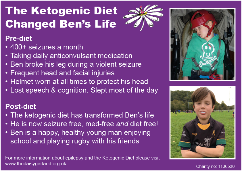Daisy Garland have been supporting Ben and his family for fifteen and a half years. Thanks to the ketogenic diet and their help Ben went from an unresponsive little boy in a pushchair, wearing a crash helmet to a healthy rugby playing teenager (see above).